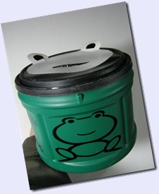 4) Cut a slot in the top. I made a frog face (with no mouth) on my Silhouette and placed it so the slot is the mouth and the ears stand up on the edge. I left the backing off on the vinyl behind the ears so they would not stick to the container.